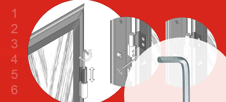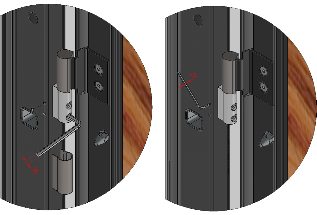- With a 3 mm Allen key, turn the adjustment screws inside the frame, clockwise to reduce the space between the door and the frame on the hinges side; counterclockwise to increase it.