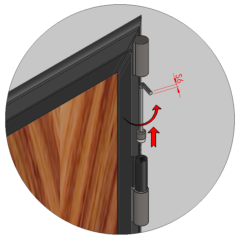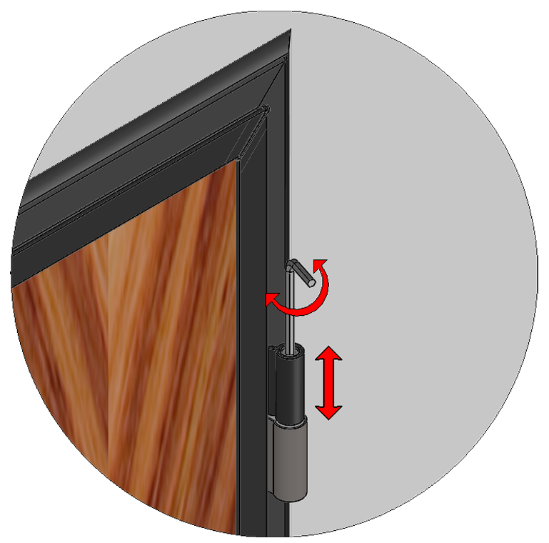 - Use the same key on the top hinge, turning the rotation pin counterclockwise to lower the door leaf, or clockwise to raise it.
