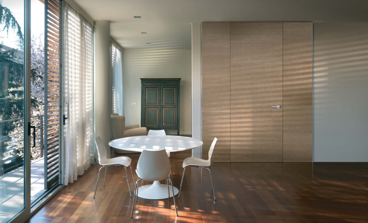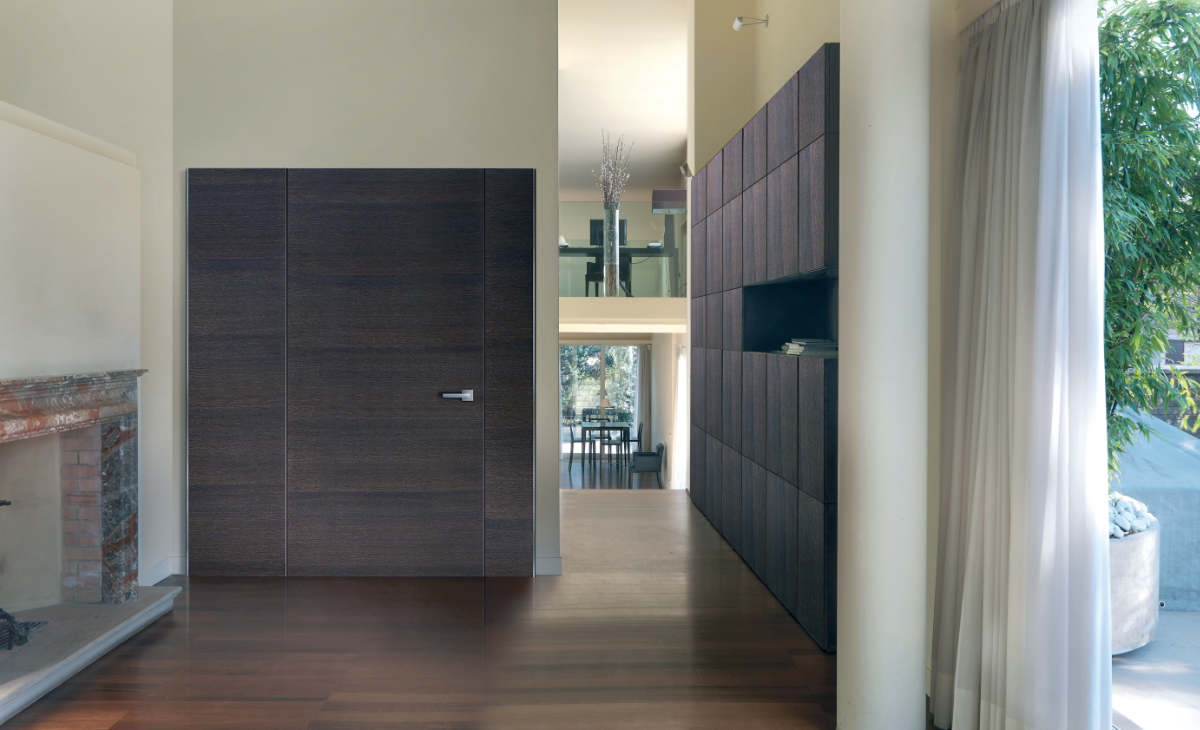 Un’essenza come il rovere sbiancato a venatura orizzontale, abbinato alla praticità di ante apribili che nascondono interruttori e citofoni, dona all’ambiente sobrietà ed eleganza.